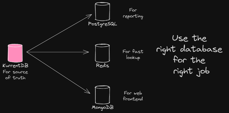 KurrentDB captures all changes (events) immutably within your system, which can be consumed by any number of downstream systems or databases in real time. This means you can reliably synchronize a variety of databases or data models, each optimized for a specific use case, without the complexity, risks, or delays of traditional batch jobs or external messaging systems.